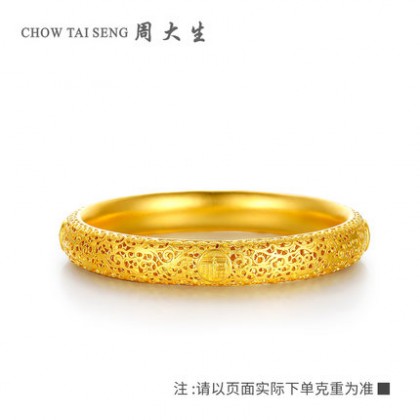 周大生启福系列古法黄金手镯女宽版福字镂空足金镯子手饰结婚三金